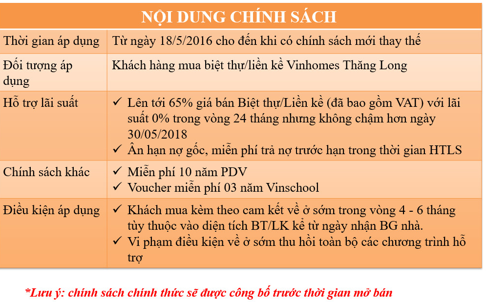 CHÍNH SÁCH BÁN HÀNG VÀ GIÁ BÁN DỰ ÁN VINHOMES THĂNG LONG