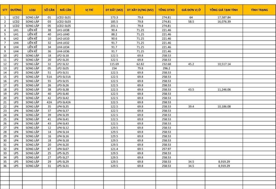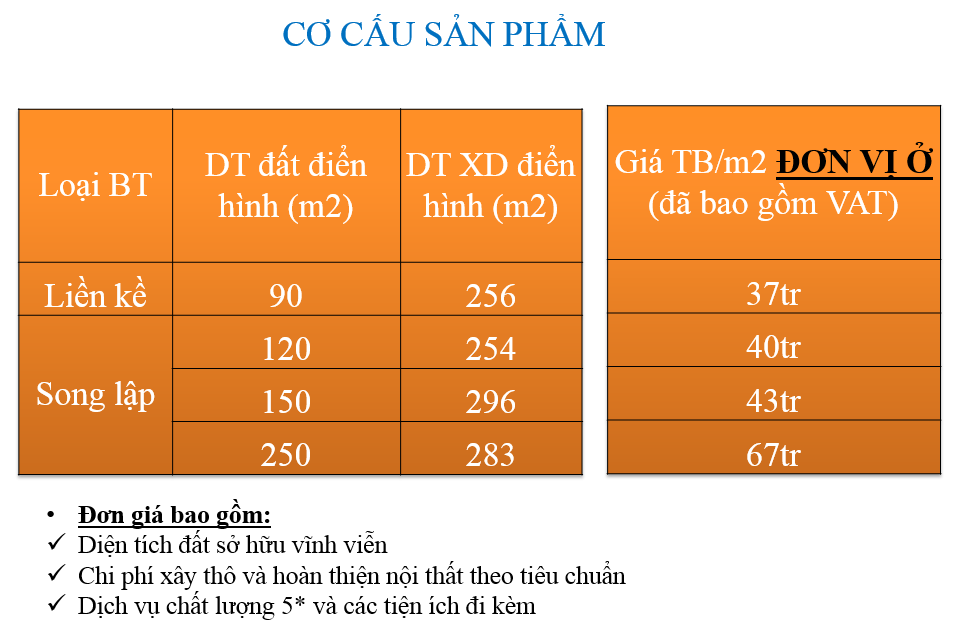 - Biệt thự song lập: 488 căn, diện tích đất từ 116,6 - 256,9m2. diện tích xây dựng từ 240 – 274m2.