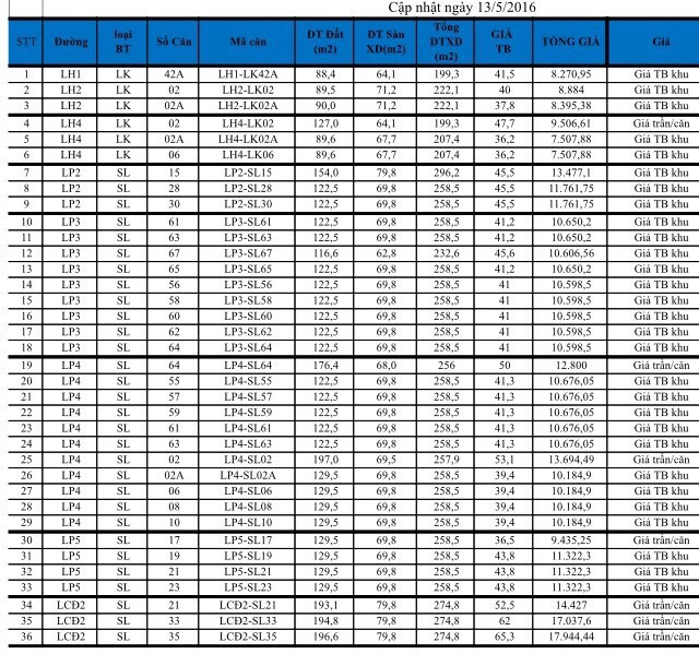 - Ngày 12/5/2016 công bố giá sàn chi tiết từng loại căn hộ.